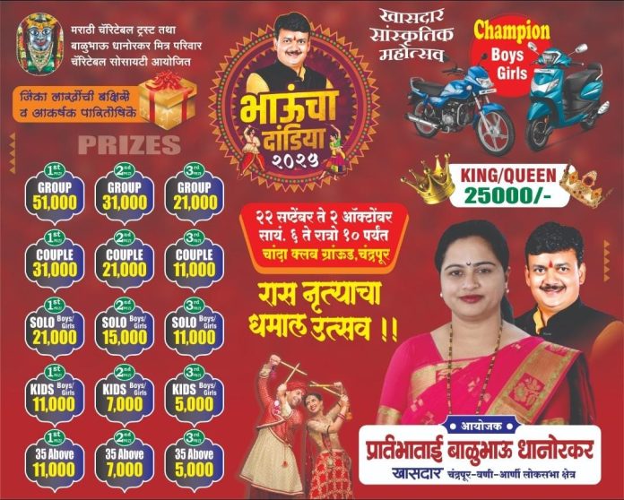 दिवंगत खासदार बाळूभाऊ धानोरकर यांच्या प्रेरणेतून या दांडियाची सुरुवात झाली होती, आणि ती परंपरा आजही अखंड सुरू आहे. या महोत्सवात गरबा-दांडियाचा मनमुराद आनंद लुटण्यासोबतच स्पर्धकांना दोन दुचाकी आणि रोख बक्षिसे जिंकण्याची सुवर्णसंधी मिळणार आहे.