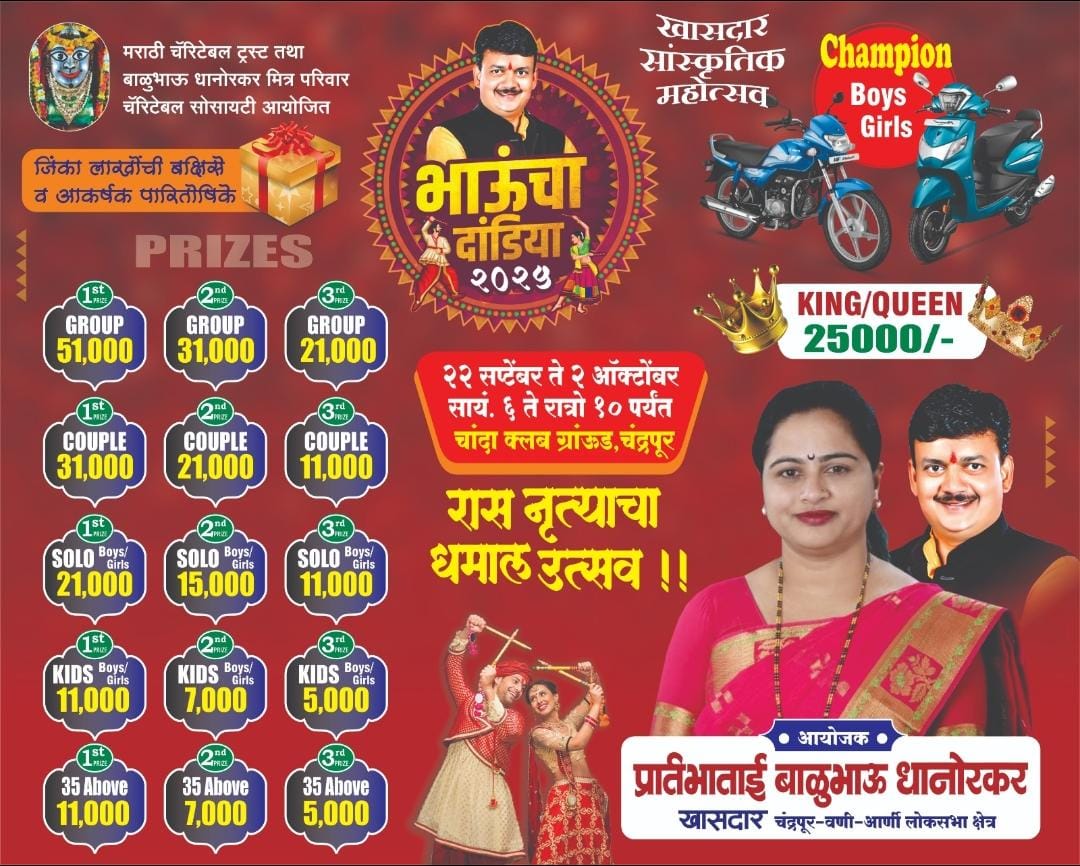 हा महोत्सव २२ सप्टेंबर ते २ ऑक्टोबर या कालावधीत दररोज सायंकाळी ६ ते रात्री १० वाजेपर्यंत चालणार आहे. ‘भाऊचा दांडिया’मध्ये सहभागी होणाऱ्या स्पर्धकांसाठी आकर्षक बक्षिसे ठेवण्यात आली आहेत, ज्यात दोन विजेत्यांना दुचाकी आणि इतर रोख बक्षिसे दिली जातील. चंद्रपूरकरांनी मोठ्या संख्येने या महोत्सवात उपस्थित राहून कार्यक्रमाची शोभा वाढवावी, असे आवाहन मराठा चॅरिटेबल ट्रस्ट आणि बाळू धानोरकर मित्र परिवार चॅरिटेबल सोसायटी यांच्या वतीने करण्यात आले आहे.